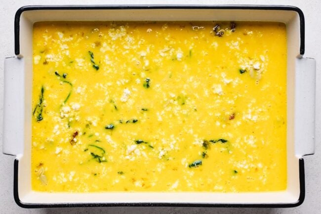 - Pour egg mixture over the veggies. Use a spatula to give it a little stir. Top evenly with feta cheese.
