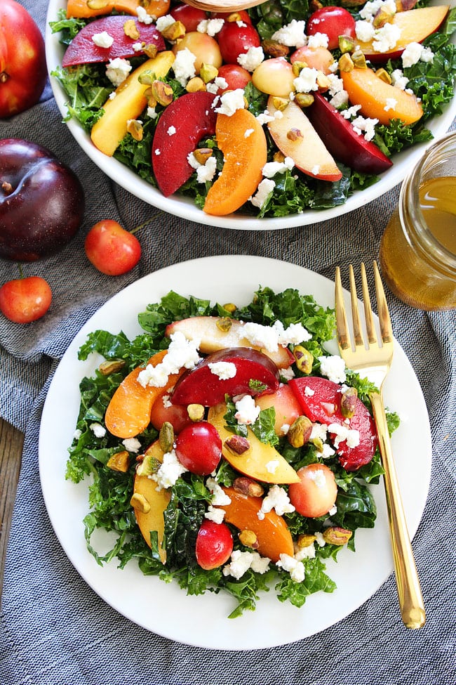 - Top the kale with peaches, nectarines, plums, apricots, and cherries. Crumble goat cheese over the top of the salad and garnish with chopped pistachios. Drizzle salad with lemon vinaigrette and serve.