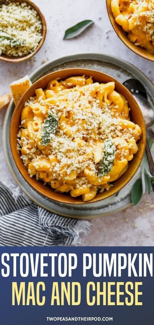 Stovetop Pumpkin Mac and Cheese with brown butter panko Parmesan sage topping is the perfect mac and cheese recipe for fall! It is easy to make and super comforting! Enjoy as a main dish or side dish!