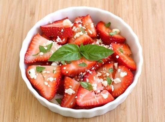 Strawberries with balsamic was one of the first things I remember my boyfriend making for me. One night after we went to dinner we went back to his apartment and were hungry for dessert. He had strawberries so he fixed them w/balsamic vinegar in champagne flutes. I love little memories like that 🙂 I bet feta and basil would be great additions!