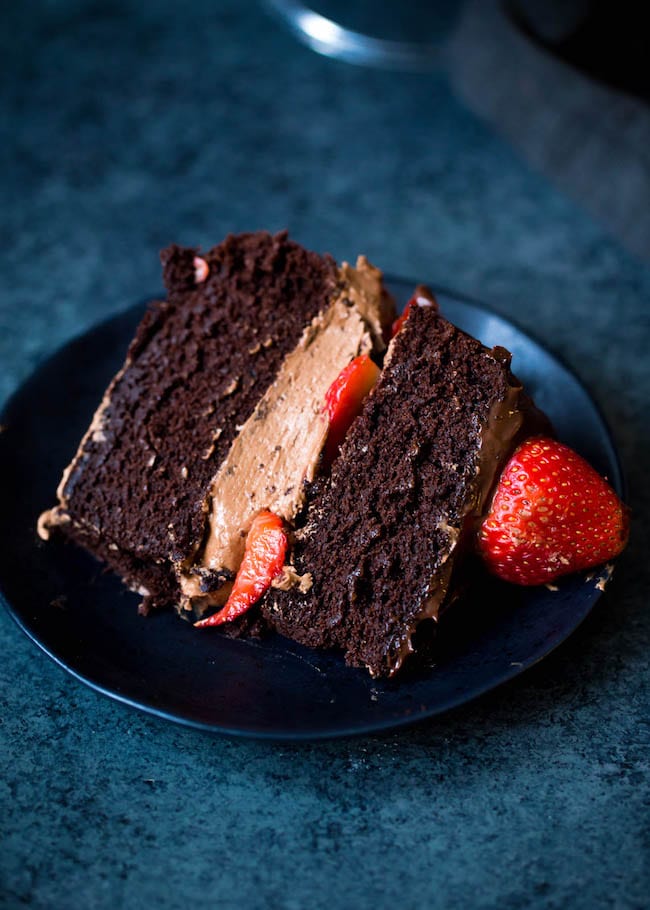To balance out all of the chocolate, the cake has a layer of strawberries in the middle and strawberries on the top. They make the cake extra pretty and you can’t go wrong with strawberries and chocolate together.