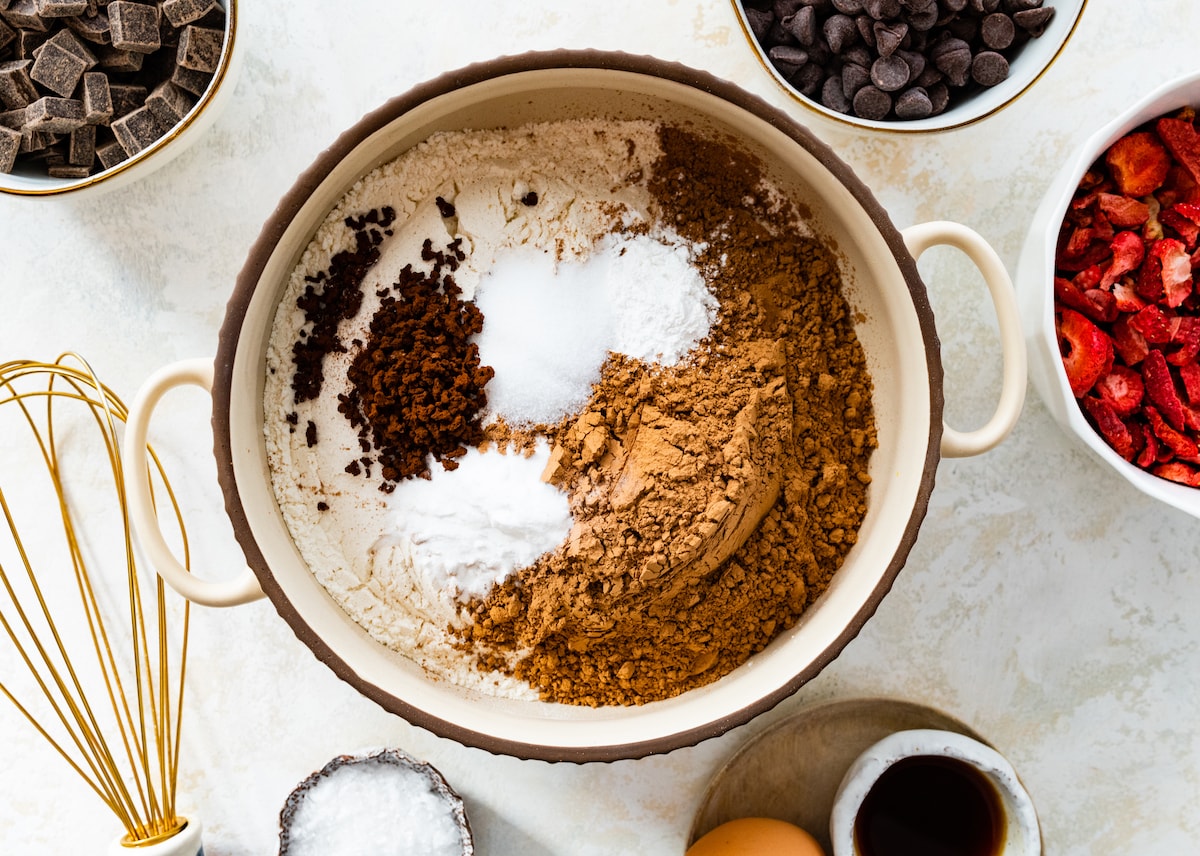 - In a medium bowl, whisk together flour, cocoa, baking soda, baking powder, salt, and espresso powder. Set aside.