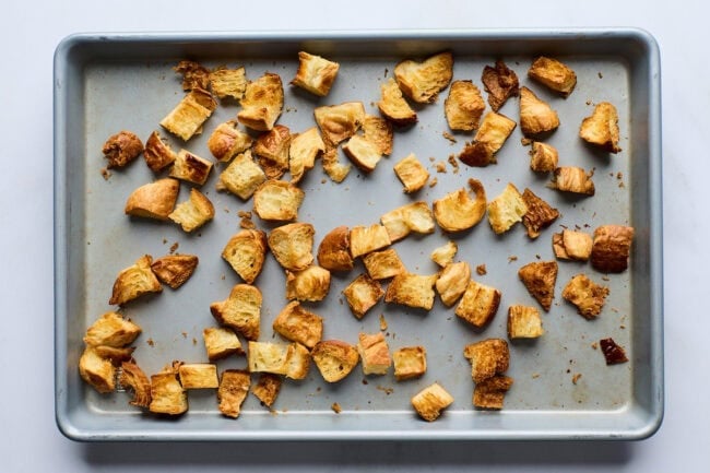 Make the croissant croutons: Preheat the oven to 375°F. Place the chopped croissant pieces on a large baking sheet in an even layer. Bake for 8 to 10 minutes, stirring once halfway through, until golden brown and crisp. Remove from the oven and let cool.