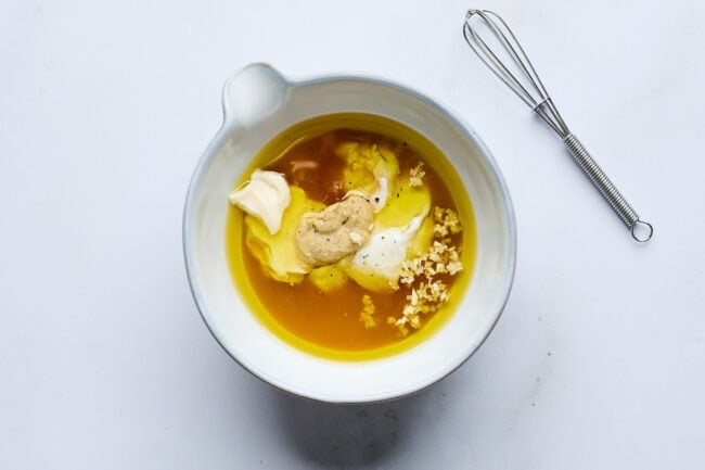 Make the dressing: In a medium bowl, whisk together the olive oil, Greek yogurt, lemon juice, mayonnaise, red wine vinegar, honey, Dijon mustard, and minced garlic. Season with kosher salt and black pepper, to taste. Whisk until smooth and creamy.