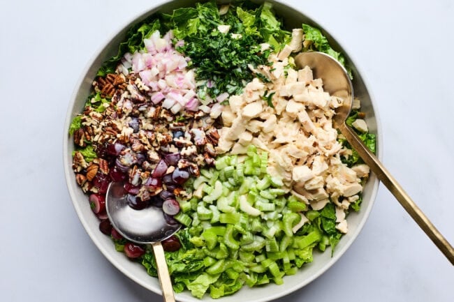 Use cold, cooked chicken (like rotisserie) so the salad stays fresh and the dressing coats well.
