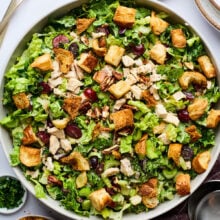 A fresh and flavorful chicken salad made with tender rotisserie chicken, sweet grapes, toasted pecans, crisp romaine, and a creamy lemon Dijon dressing. Finished with buttery croissant croutons for the perfect crunch.