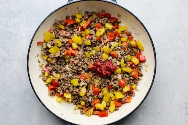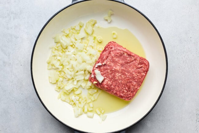 Cook the beef and onion: Heat the olive oil in a deep 12-innch skillet over medium-high heat. Add the ground beef and diced onion. Cook, breaking up the meat, until browned and the onion is softened, about 5 to 7 minutes. Drain excess grease if needed.