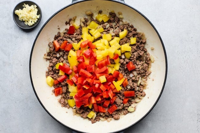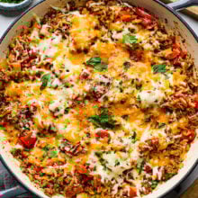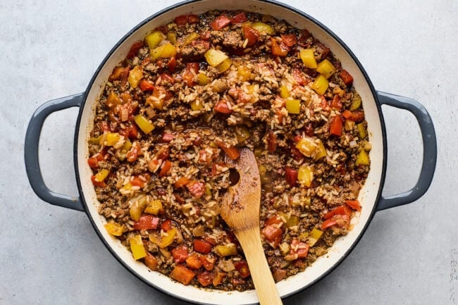 A quick and easy one-pan stuffed pepper skillet made with ground beef, rice, bell peppers, and melty cheese. All the classic flavors of stuffed peppers, without the extra work!