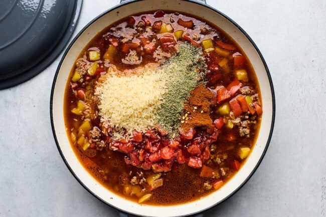 Add liquids and rice: Stir in the diced fire roasted tomatoes (with juices), rice, broth, Worcestershire sauce, Italian seasoning, paprika, salt, black pepper, and crushed red pepper flakes (if using). Stir well to combine.