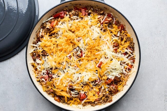 Add cheese: Give the mixture a good stir. Taste and add salt and pepper, if necessary. Sprinkle the mozzarella and cheddar cheese evenly over the top. Cover the skillet and let it sit for 2–3 minutes, or until the cheese is melted.